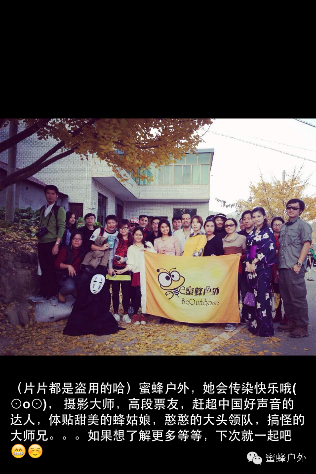 “蜜蜂户外”英文名"Be Outdoors"意为:去户外!表达了我们“拒宅”的生活理念!和“青春,就是要释放!”的生活态度!取名“蜜蜂”不只是要给人一种轻松活泼的印象,更是对我们注重“团队协作,互帮互助”的一种体现。