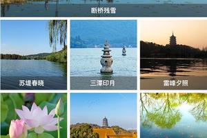 西湖十景:①苏堤春晓、②断桥残雪、③平湖秋月、④三潭印月、⑤柳浪闻莺、⑥双峰插云、⑦花港观鱼、⑧南屏晚钟、⑨雷峰夕照、⑩曲院风荷