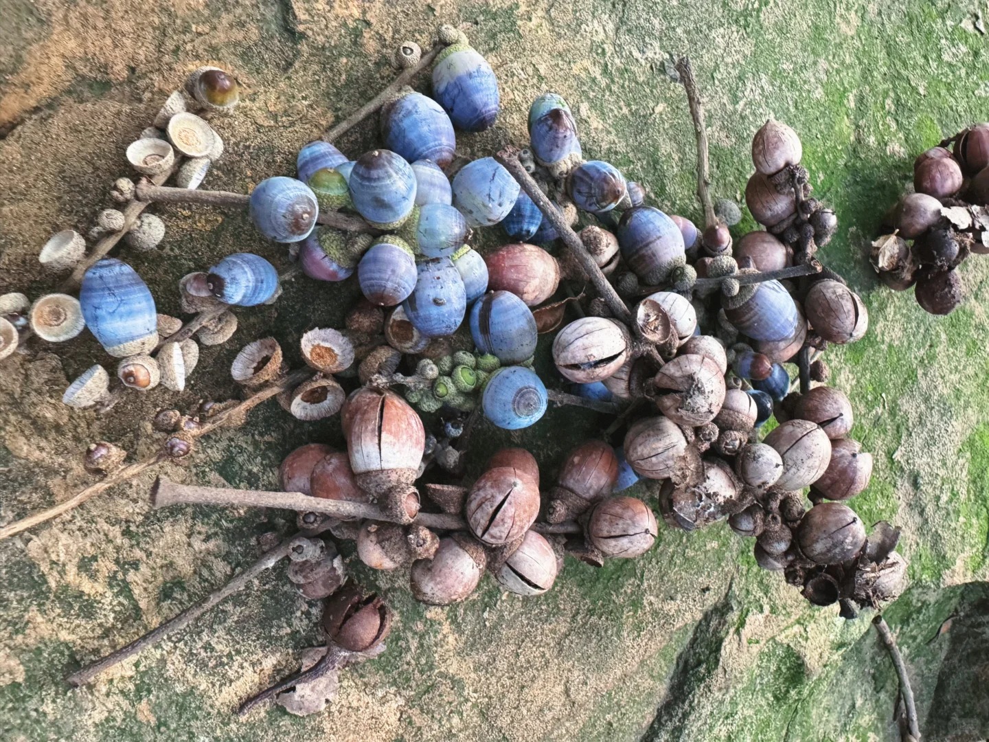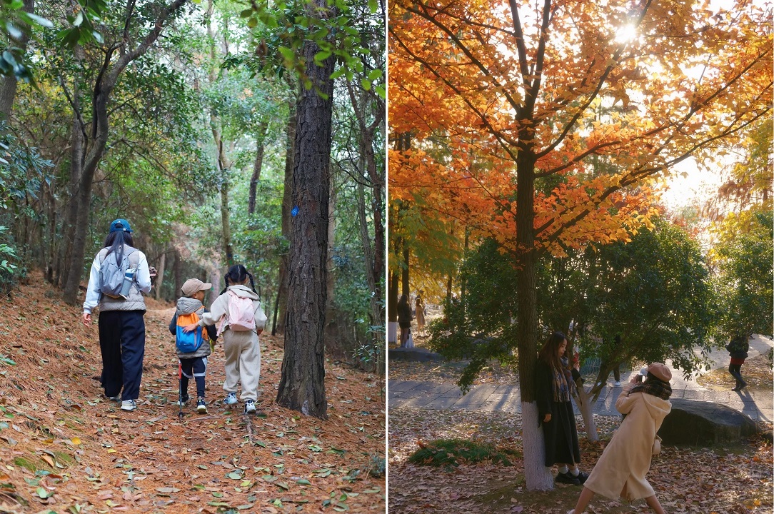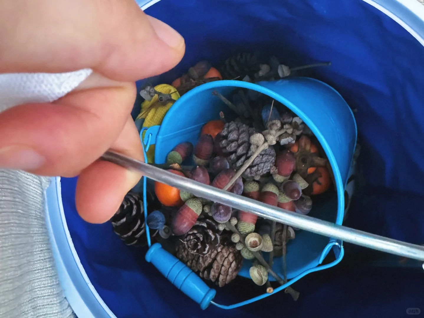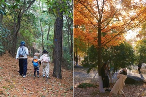 台阶上去路两边全是橡果,小朋友捡的超开心,往上走还有野柿子,下山路上有松果!