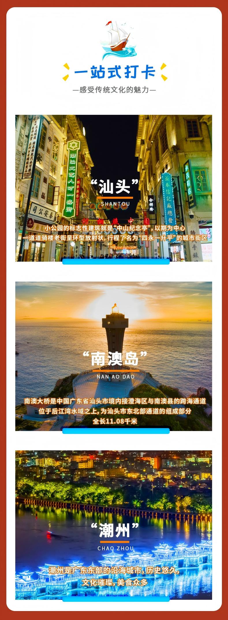 ②当天自由活动,推荐行程:老妈宫戏台、汕头小公园、邮政总局、汕头旅社、潮人码头、西堤公园、广场轮渡