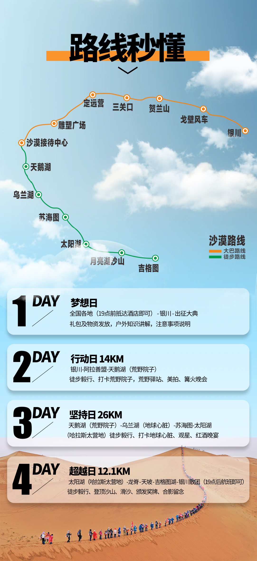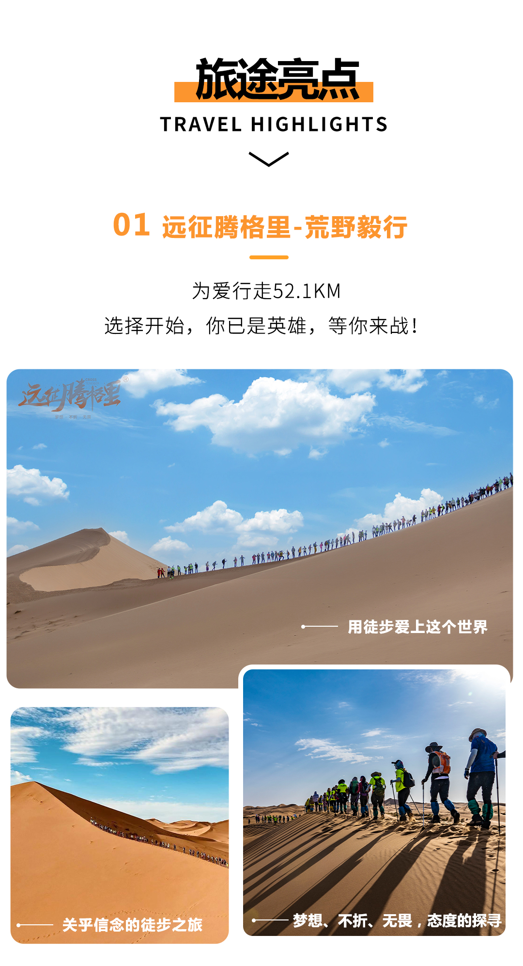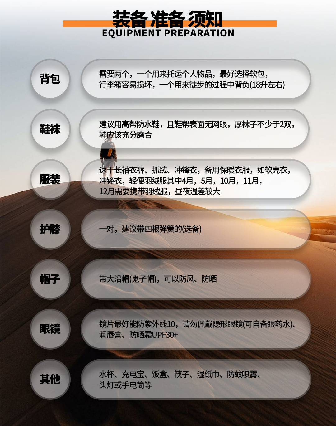 01 此旅行活动不同于传统旅游线路,对参加队员的安全、环保和团队协作精神要求较高,要求体现中华传统美德。全程徒步过程中,严禁丢弃任何不可降解垃圾,组织方会提供大型编织袋垃圾袋,所有垃圾请归拢至垃圾袋,由物资车统一运出沙漠。