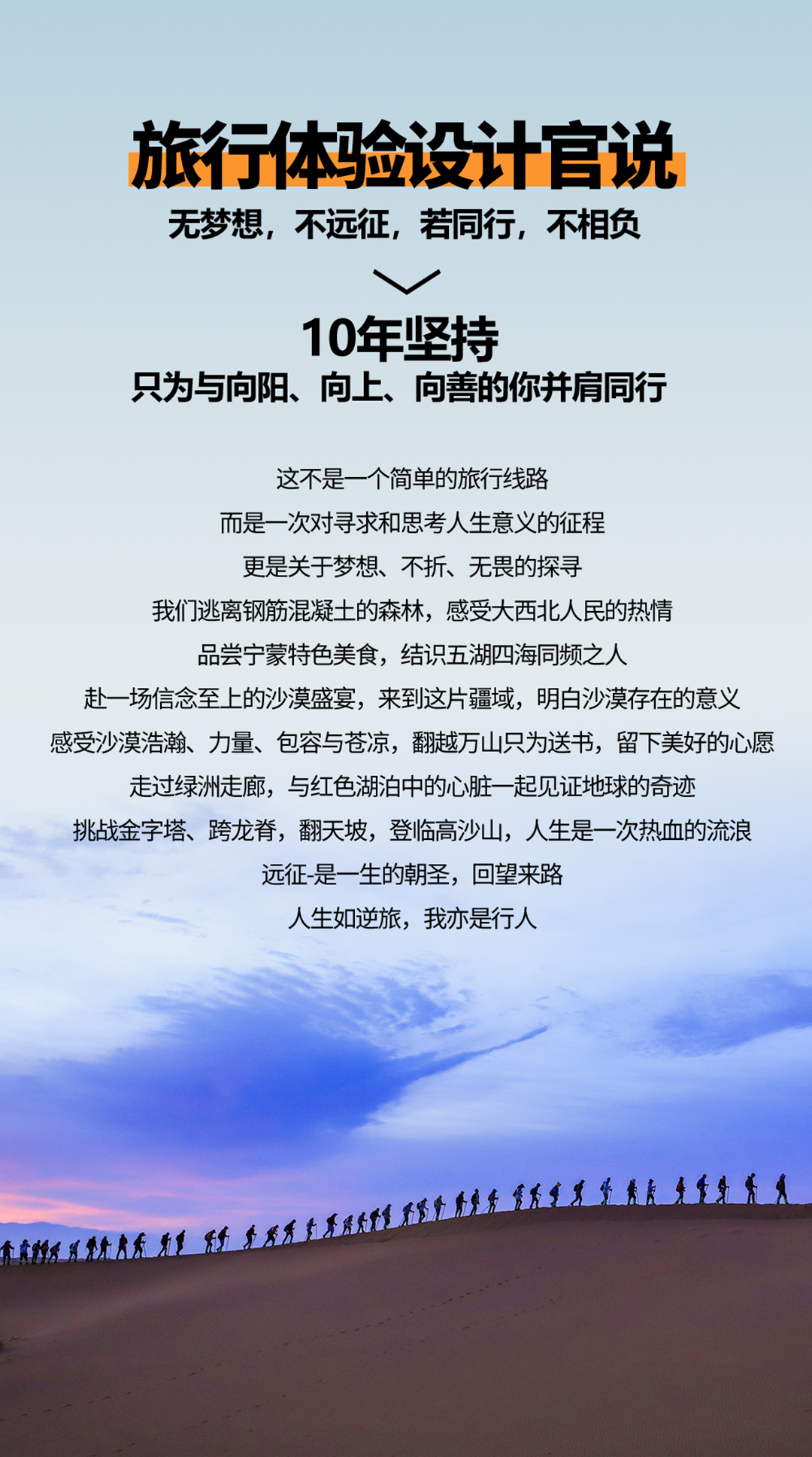 人生是一次热血的流浪,怀揣热血心脏,走沙漠不仅是一场徒步,回望来路,人生如逆旅,我亦是行人,万物之中,希望最美。