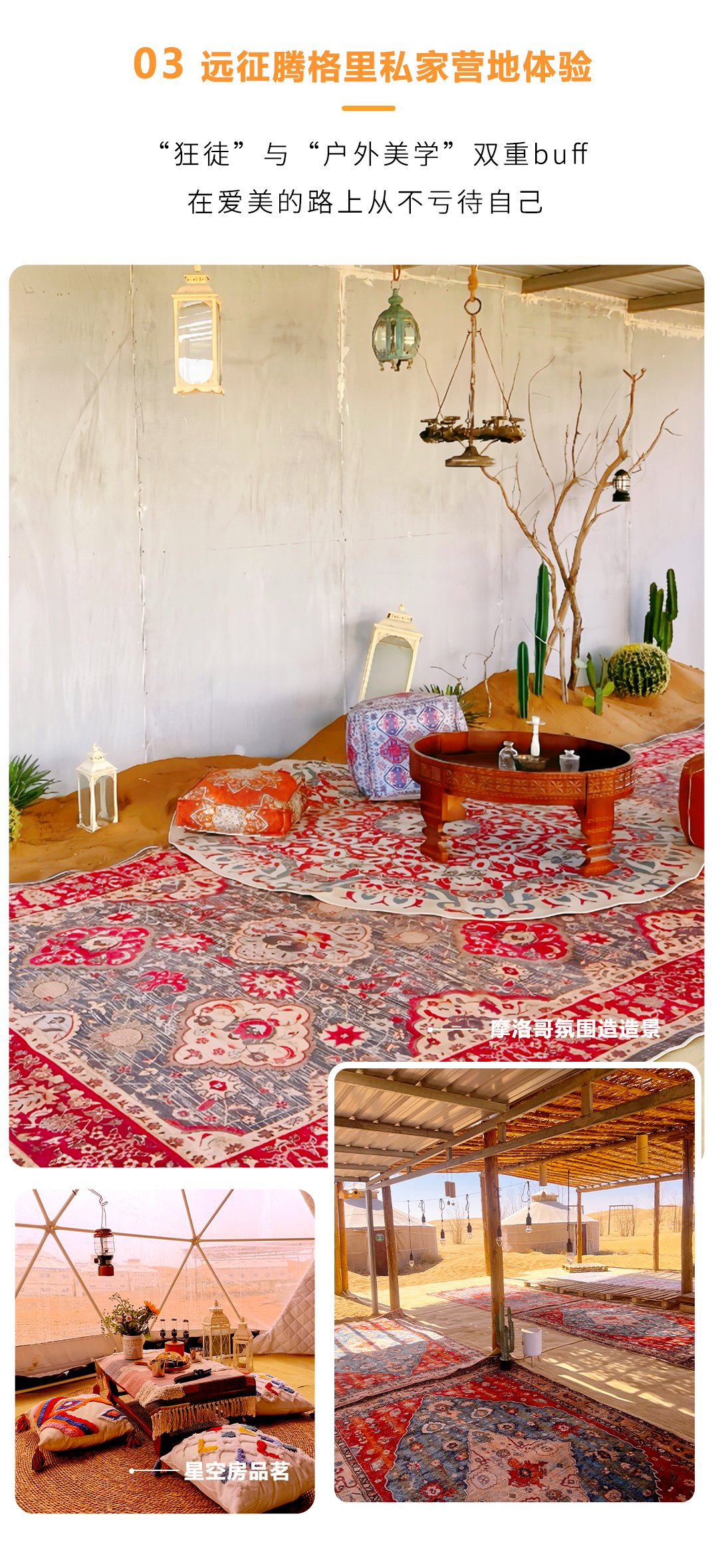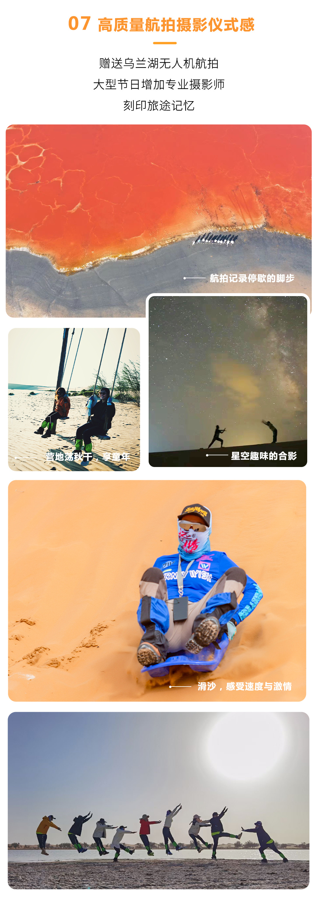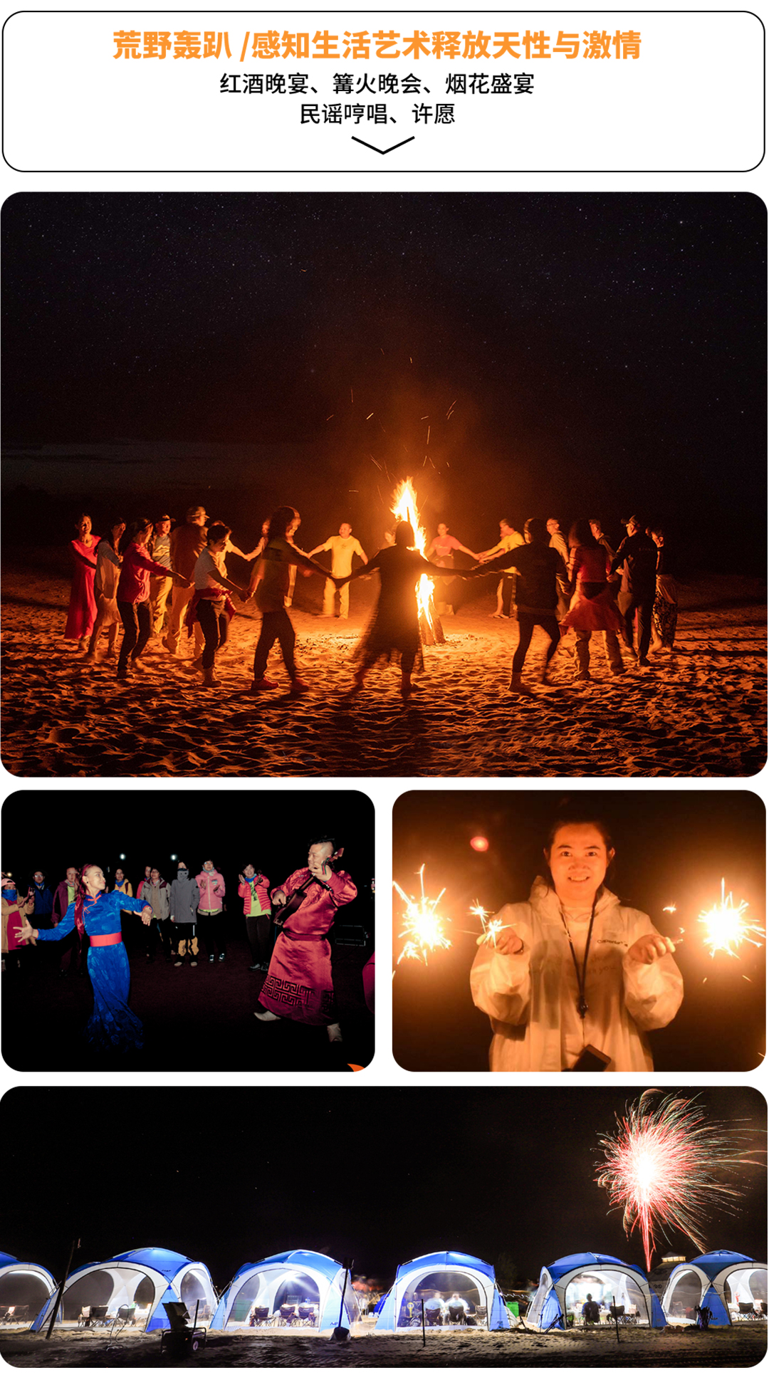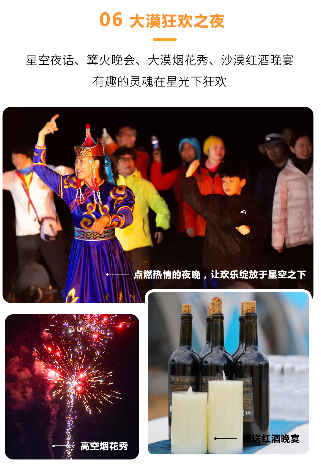 03 高空烟花:根据人数不同,提供高空烟花,让你在腾格里的这个夜留下终生难忘的美好回忆。