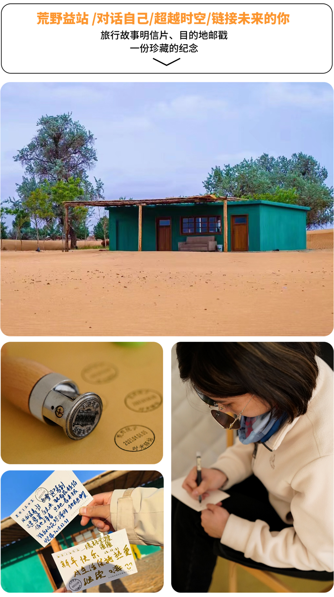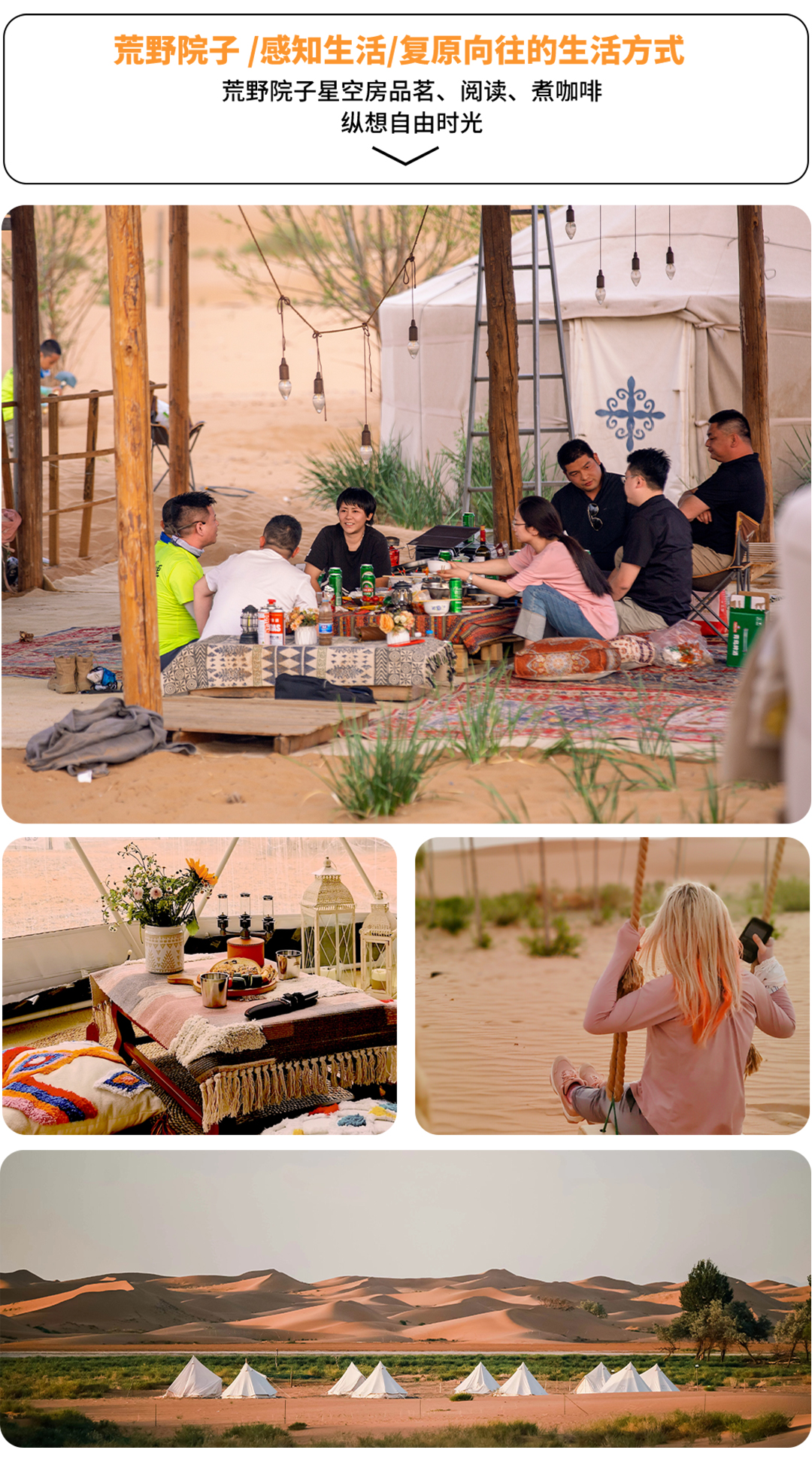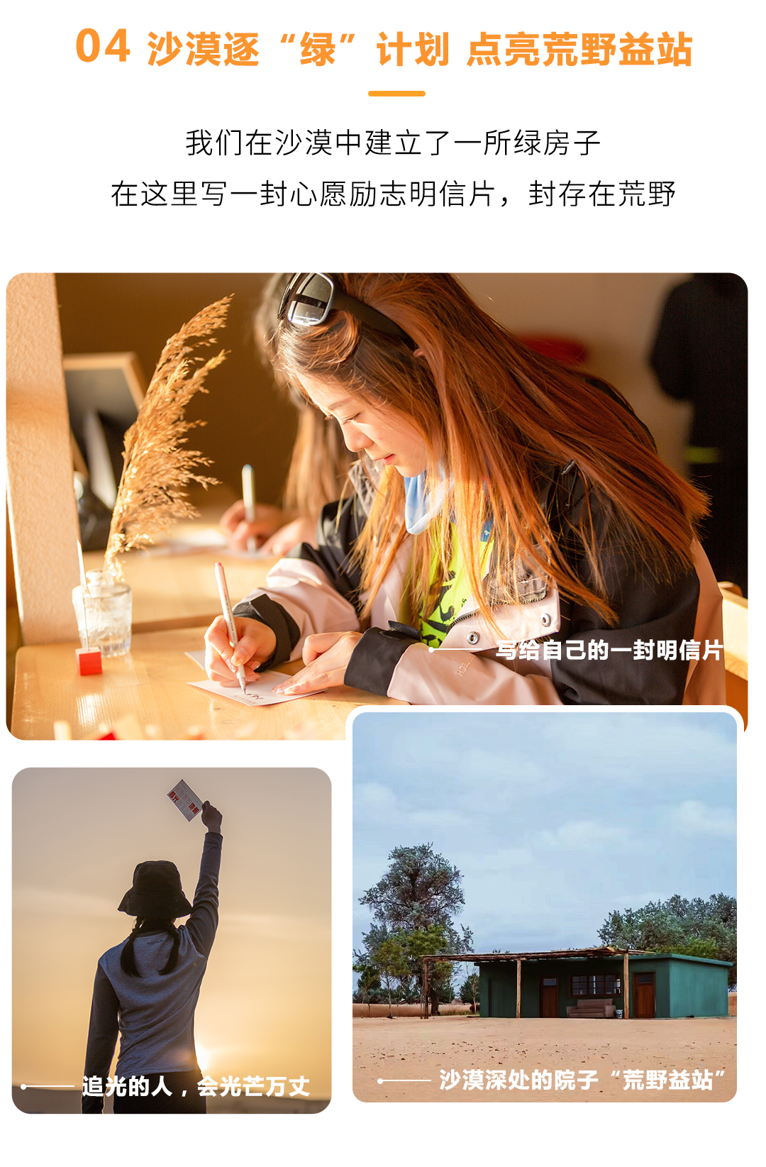 下午约17:00抵达天鹅湖畔,天黄沙的世界里,忽然眼前出现一片绿洲,水草丰美,这是一番怎样的景象?后勤已为大家搭建好天幕,备好八宝茶与时令水果,领队带大家拉伸后,稍作休息,安营扎寨,换上漂亮裙子,开启荒野大片拍摄,走进荒野益站捐一本书,送给残疾儿童,也可在这里选一张能量满满的明信片,写下心愿,封存在时光驿站中。