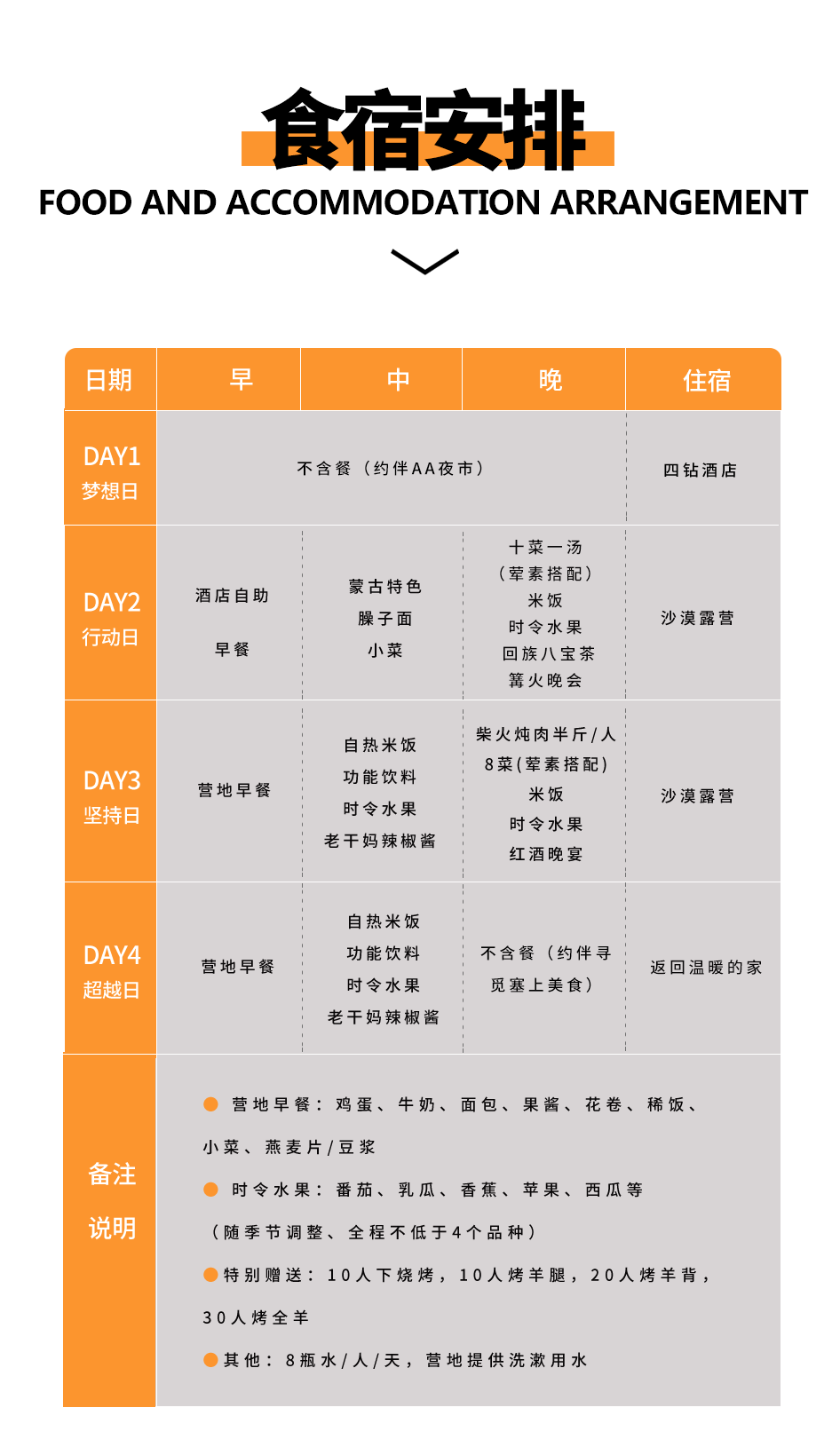 01 为队员们在银川提供了一晚的舒适住宿,尽管如此,队员们应该有充分的心理准备,两晚沙漠露营,我们会提供双人帐篷,抗风抗雨;专业级睡袋;专业防潮垫。但仍会与酒店舒适度有比较大的差距。