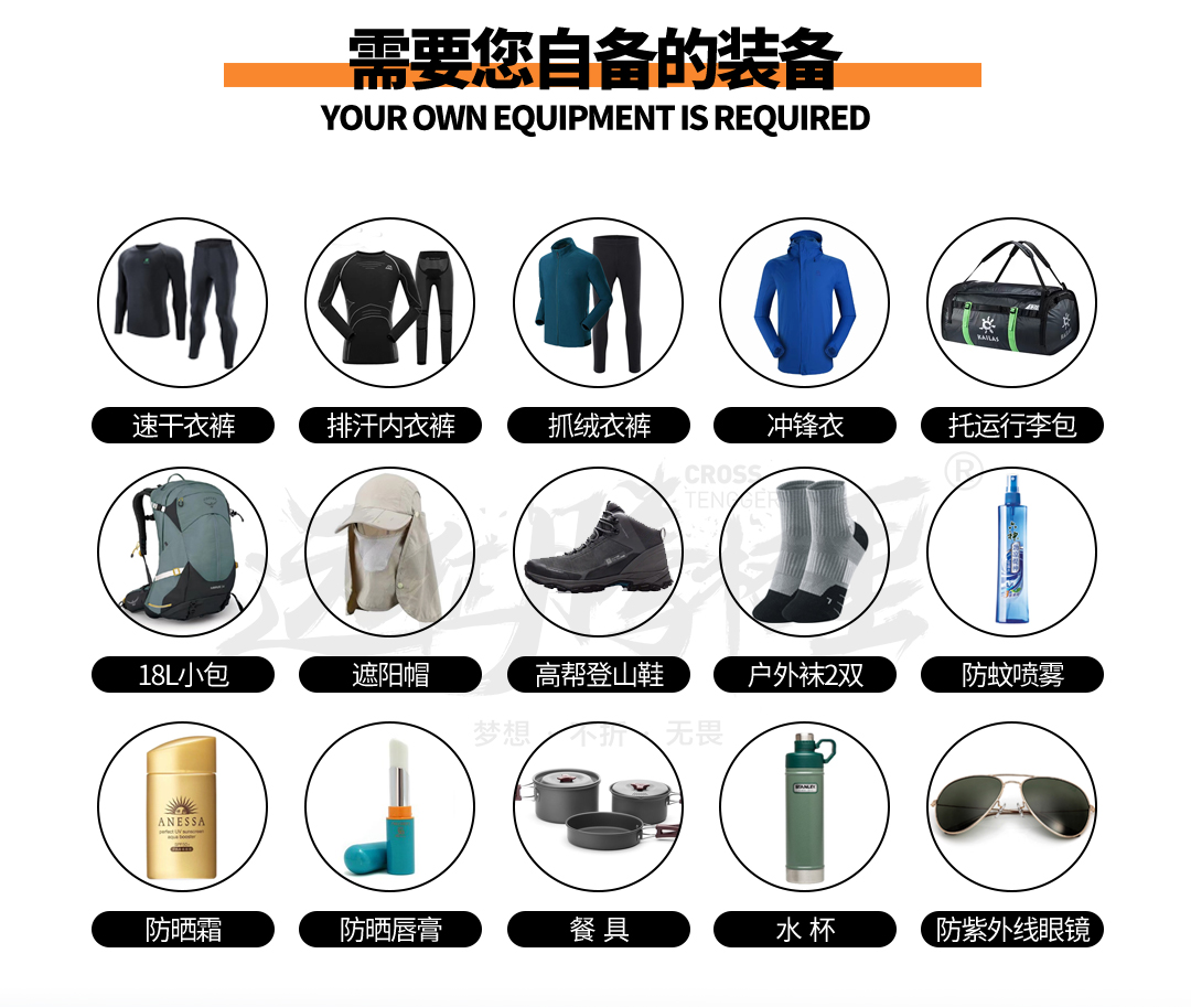 2) 鞋子:防滑防水保暖高帮徒步鞋(坚决杜绝穿高跟鞋),建议为非网面鞋子;