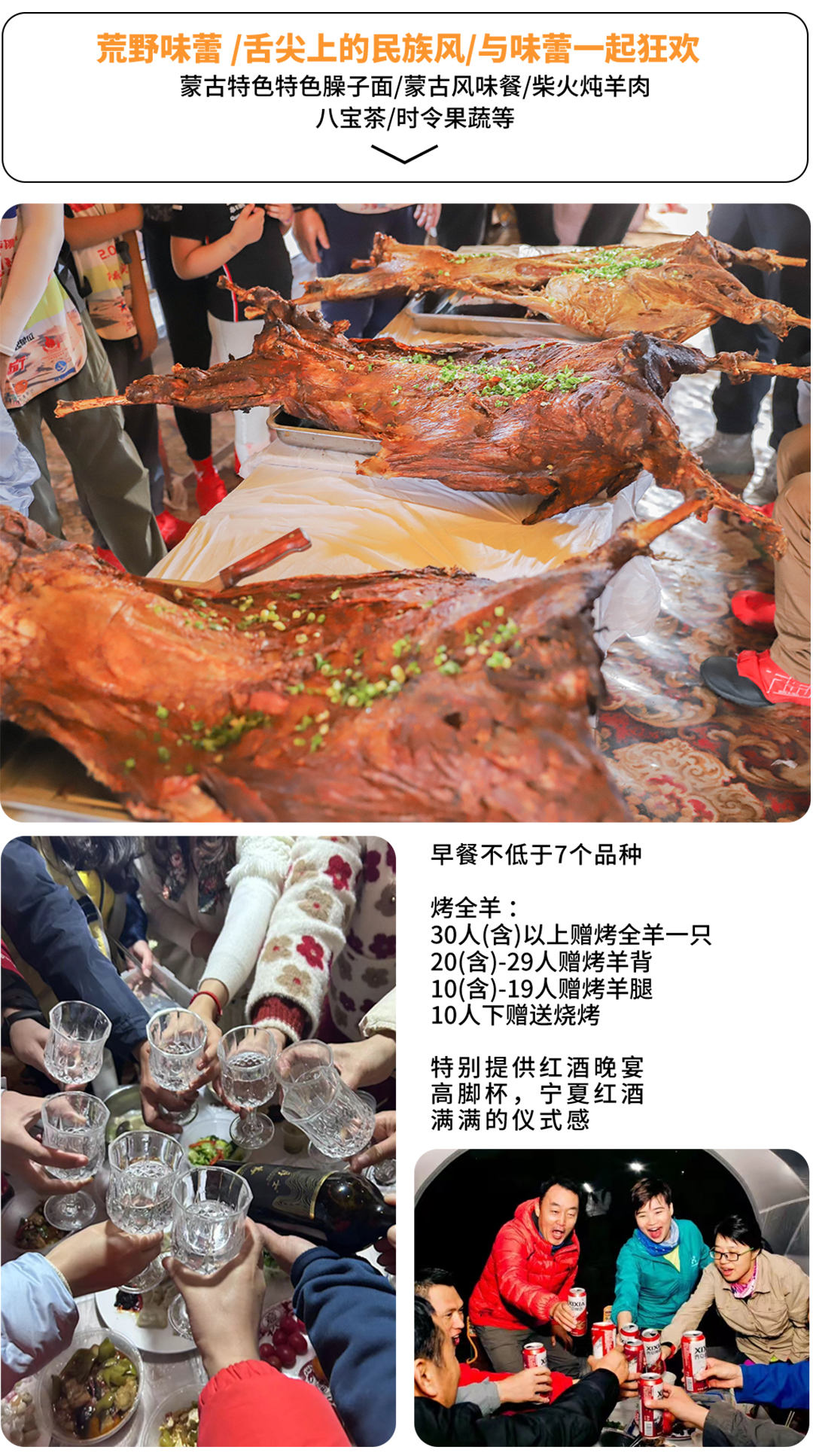 01 烤全羊 :30人(含)以上队伍赠送烤全羊一只;20(含)-29人赠送烤羊背;10(含)-19人赠送烤羊腿;